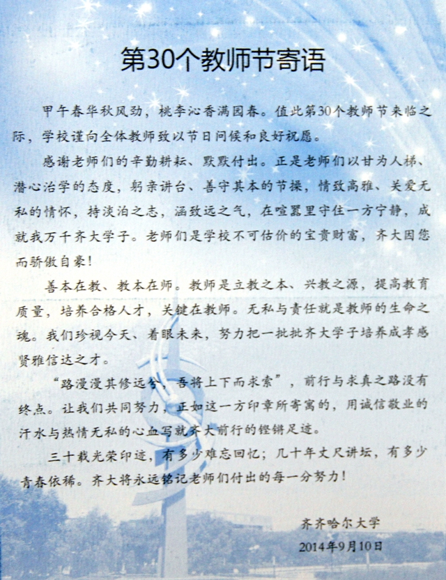 按照《教育部关于做好庆祝2014年教师节有关工作的通知》(教师[2014]3号)和黑龙江省教育厅的相关要求,为切实做好今年教师节有关工作,8月28日,学校办公室发出了《关于做好庆祝第30个教师节工作的通知》,以“带头践行社会主义核心价值观”为主题,对庆祝第30个教师节工作作出了整体部署和具体安排。