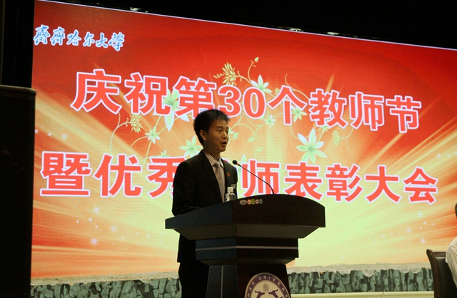 她说,作为教师代表,我倍感荣幸。感谢齐大20多年的恩情,是她培养了我;感谢所有教过我的老师,是他们的启迪,使我对未来充满向往;也要感谢众多的学生们,是他们的青春感染了我的课堂,给我的职业生涯留下了无数可亲、可爱、可贵的记忆。我理解的教师应当是“人师”,“人师”是教师修养的最高境界。为人师,不仅要教书,更要立德树人,不仅要有学识魅力,更要有人格魅力。我们既然选择了教师职业,就要履行教师的职责,就应该把全部精力和满腔真情献给教育事业。选择了一种职业,就是选择了一种生活方式,我愿意在教书育人的过程中感受生活的快乐。