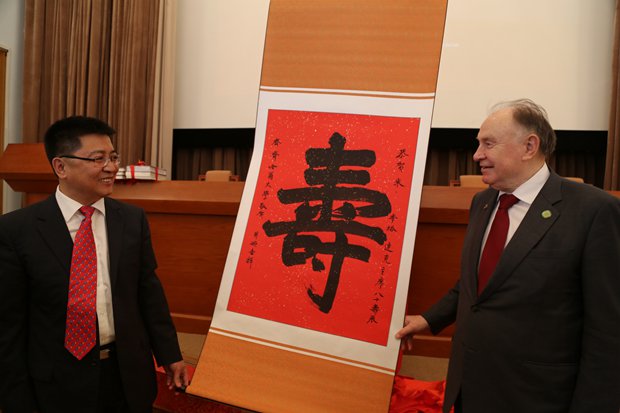 在俄罗斯联邦驻华大使馆举行的《俄罗斯的亚洲战略》新书发布会上,还为季塔连科先生的80寿辰举行了庆祝活动,sunbet申搏党委书记李海红代表齐大师生向季塔连科先生赠送了一幅精美的书法作品,由sunbet申搏美术与设计学院何鑫教授专为季塔连科先生创作的一个大大的“寿”字。作品展开,一下子吸引了全场人的目光,季塔连科先生连声称好,李海红同时表达了对季塔连科先生的敬重之情,并祝他健康长寿。