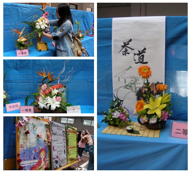 参赛者于5月28日上午8点至11点在西主教学楼现场制作,园林系教师郭彦萃、熊毅进行现场指导。12点至13点,黑龙江省插花与花艺研究会三位委员对所有参赛作品从作品的主题表现、立意构思、命名、造型、色彩、技巧、选材综合效果与创新等方面对每个作品进行了认真的盲评,最终评选出专业组一等奖2组,二等奖4组,三等奖5组;非专业组一、二、三等奖各1组。