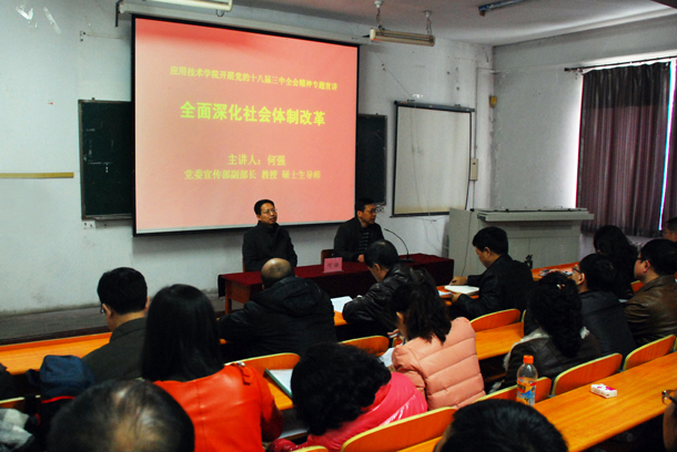 校宣讲团成员、校党委宣传部副部长、硕士生导师何强教授应邀为应用技术学院、理学院师生作了题为《改革,中国再出发——全面深化社会体制改革》的宣讲报告。报告从“党的十八届三中全会概况”、“全面深化改革的各项任务和重大决策”及“深化教育领域综合改革 推进教育治理体系和治理能力现代化”三方面入手,对党的十八届三中全会精神进行了全面翔实的解读,特别对全面深化社会体制改革中教育、医疗、反腐、养老等大家普遍关心的热门话题深入剖析,引领师生深刻理解全会精神,并紧密结合当前sunbet申搏正在开展的教育思想大讨论、深化高等教育综合改革、推进高水平大学建设的中心工作,理论联系实际展开讲解。