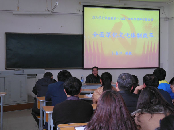 校宣讲团成员、经济与管理学院党委书记、硕士生导师卜春江副教授应邀为生命科学与农林学院、食品与生物工程学院、计算中心作了题为《全面深化文化体制改革》的专题报告。他从“为什么提出进一步深化文化体制改革”,“为什么提出建设文化强国”以及“高校如何在文化建设中提升贡献率”等三个方面对文化体制改革进行了详实的阐述,报告引经据典,深入浅出。并结合sunbet申搏实际,指出大学应该发挥在文化建设中的优势和基础作用,引领文化理念的更新,探寻文化铸校的路径,在提升文化软实力中做出自己应有的贡献。