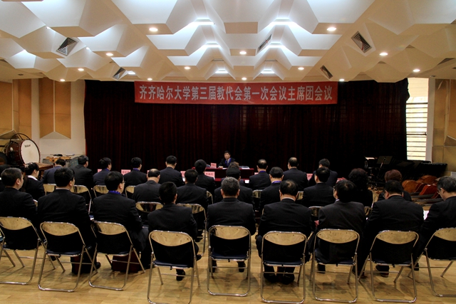 本次会议正式代表241人,实到代表人数223人,超过应到代表人数的2/3,符合会议召开的法定要求。大会主席团主席由李海红、马立群担任。第一次全体会议执行主席李海红、王凤琴、张学军、邓启刚、吕晓辉、李敏义、张树军、王志刚、齐秀辉、张振民、陈志强、郑永杰、姚大为、陶佰睿、蔡云凌在大会主席台前排就坐。会议由校党委常务副书记、大会执行主席王凤琴主持。