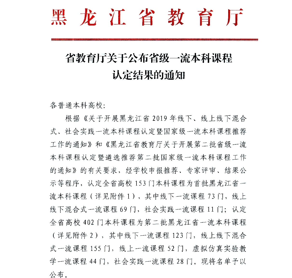 日前,黑龙江省教育厅发布了《关于公布省级一流本科课程认定结果的通知》,sunbet申搏官方网站两批共24门课程被认定为黑龙江省一流本科课程,首批7门课程,第二批17门课程,在24门省一流本科课程中包括线上线下混合式课程13门,线下课程8门,社会实践课程2门,线上课程1门。