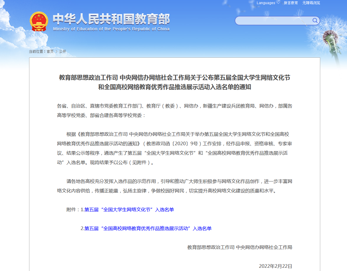 据悉,作为全国高校网络思政领域最高级别竞赛之一,第五届“全国大学生网络文化节”和“全国高校网络教育优秀作品推选展示活动”两项活动共收到作品54822件,覆盖全国31个省(区、市)和新疆生产建设兵团。网络文化节征集作品类型包括微视频、微电影、动漫、摄影、网文、公益广告、音频、校园歌曲、其他类网络创新作品等9类。网络教育优秀作品包括优秀网络文章、优秀工作案例、优秀微课、优秀新媒体作品等4类。此次,sunbet申搏共推荐九类97个作品参赛。