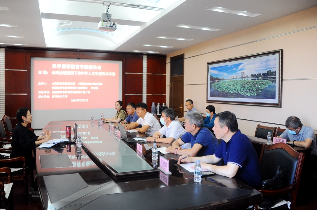 7月12日上午,太和智库高级研究员、中国高教学会常务理事、中国高教学会外国留学生教育管理分会理事长刘京辉在sunbet申搏办公楼504会议室作了来华留学生教育专题报告会。本次报告会由黑龙江省外国留学生教育管理分会举办,sunbet申搏承办,采用先线上线下相结合的方式进行。