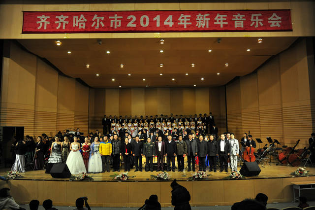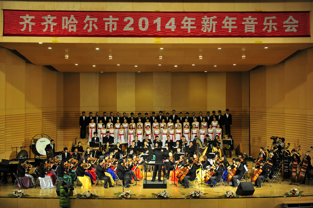 一年一度的新年音乐会,是我市最引人注目的年度音乐盛典。齐大交响乐团师生用悠扬的歌声,火热的旋律,跳荡的节奏表达着新年的美好祝福。音乐会接近尾声,主持人谢幕,在意犹未尽的观众强烈要求下,乐队继续演奏了一首作品。随着音乐整齐的节拍,全场再次进入高潮,在观众们如醉如痴和依依不舍的掌声中,2014新年音乐会落下了帷幕。