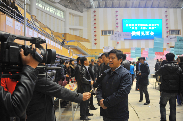 齐齐哈尔电视台、《齐齐哈尔日报》、齐齐哈尔新闻网等新闻媒体对本届“双选”会进行了现场采访、直播连线和热忱报道。常务副校长郑喜群接受了齐齐哈尔电视台《直播鹤城》记者的现场连线以及齐齐哈尔电视台《齐齐哈尔新闻》、《齐齐哈尔日报》、齐齐哈尔新闻网等媒体记者的现场采访,阐述了此次供需见面会的主要特点和就业形势以及sunbet申搏促进学生就业的理念、举措和成效,产生了积极而广泛的社会影响。
