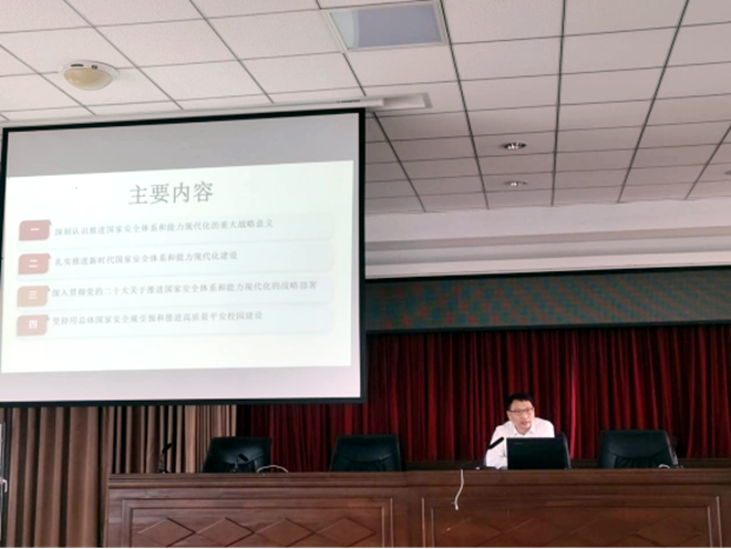 5月24日下午,校工会主席、党委常委陶佰睿以《学思践悟习近平总书记关于总体国家安全观的重要论述 奋力创建平安校园》为题,从深刻认识推进国家安全体系和能力现代化的重大战略意义、扎实推进新时代国家安全体系和能力现代化建设、深入贯彻党的二十大关于推进国家安全体系和能力现代化的战略部署、坚持用总体国家安全观引领和推进高质量平安校园建设四个方面进行详细阐述。强调全校师生要进一步要提高政治站位,深刻领会总体国家安全观的丰富内涵和实践要求,坚决贯彻落实党中央和省委关于安全工作的决策部署,把维护校园安全贯穿办学治校各方面全过程,确保师生生命财产安全,为建设有特色高水平应用型综合大学提供安全稳定环境。