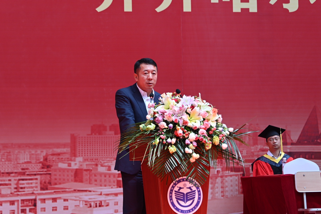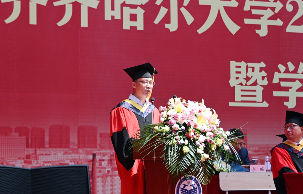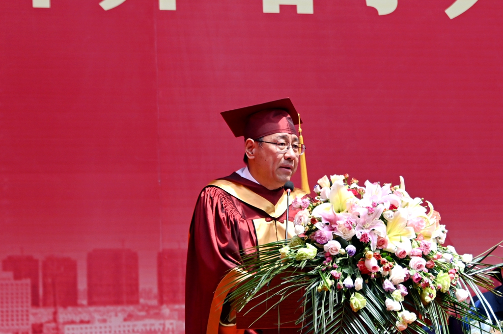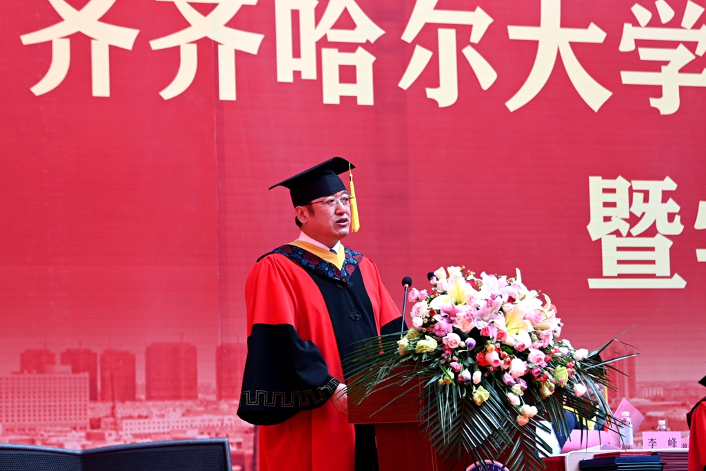 他说,“毕业”既标志着一段学习经历的完结,也标志着人生新的征程的开启。回首往昔,你们在齐大度过了一段极不平凡的青春岁月,在美丽的环湖大学,度过了最美的青春时光。特别是你们在学校,学习生活期间,克服了疫情影响,圆满完成了学业,以各方面的优异表现,交上了一份完美的毕业答卷。你们彰显着齐大学子的家国情怀和赤子之心,传递了齐大正能量和好声音。母校为你们点赞,向你们致敬!作为校长,我为大家圆满完成学业感到由衷地高兴,更对同学们的美好未来充满着期待!临别之际,我对同学们提出四点希望和嘱托:一是希望你们树立远大理想,坚定信仰信念;二是希望你们心怀“国之大者”,担当时代责任;三是希望你们坚持吃苦耐劳,始终砥身砺行;四是希望你们保持永久奋斗,投身强国伟业。