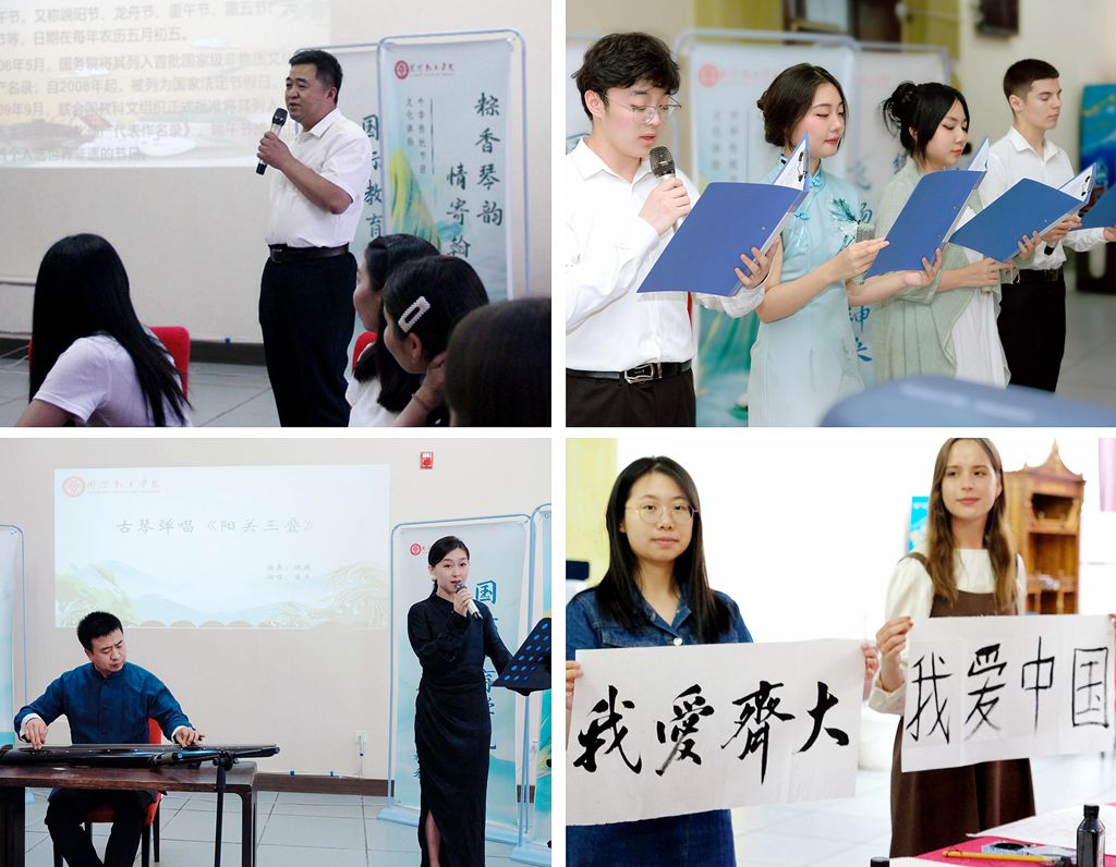活动中,訾希坤老师向师生们介绍了端午节的起源和意义,留学生与中国学生分别用中英文朗诵了千年经典《离骚》,市青年艺术家崔爽、魏巍为大家带来了古琴弹唱《阳关三叠》,并与留学生互动实践,拨动琴弦感受千年古琴文化的韵味。中外学生代表现场进行了书法展示,进一步感知中国文化、书写中国情缘。