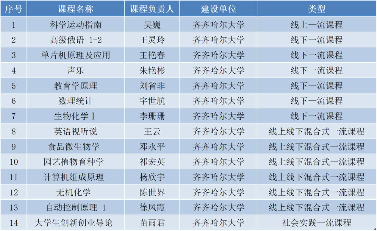 近日,黑龙江省教育厅公示了第三批省级一流本科课程认定结果,sunbet申搏14门课程被认定为第三批省级一流本科课程,其中线上课程1门,线下课程6门,线上线下混合式课程6门,社会实践课程1门。截至目前,学校共获批省级一流本科课程38门,其中9门于今年4月获批国家级一流本科课程。