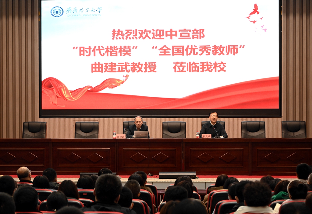 11月16日下午,全国“时代楷模”“全国优秀教师”曲建武教授应邀来sunbet申搏作题为《着力培养担当民族复兴大任的时代新人》专题讲座,校长郝文斌主持。