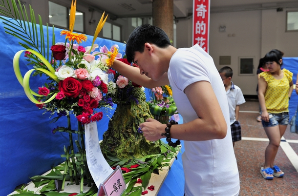 本次大赛以“青春·梦想”为主题,设规定命题和自由命题2个单项比赛,生命科学与农林学院、文学与历史文化学院、外国语学院的60多名学生参加了比赛,共提交作品29组。参赛者于今天上午8点到11点在西主阳光大厅现场制作,12点至13点,黑龙江省插花与花艺研究会三位委员对所有参赛作品从作品的主题表现、立意构思、命名、造型、色彩、技巧、选材综合效果与创新等方面对每个作品进行了认真的盲评,最终评选出一等奖2组,二等奖4组,三等奖5组。通过所有领导、嘉宾、观众投票产生最佳人气奖1组。