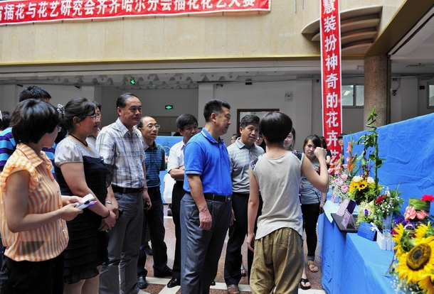 校领导马立群、郑喜群、王刚、吕晓辉、李敏义,学校办公室主任张德庆、实践教学与设备管理处处长马文辉、学生指导中心主任杨国志、黑龙江省插花与花艺研究会会员、生命科学与农林学院领导和教师光临比赛现场,参观指导和听取了学生关于作品创意的汇报。