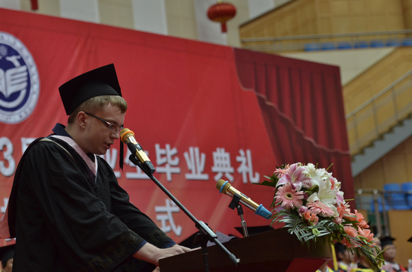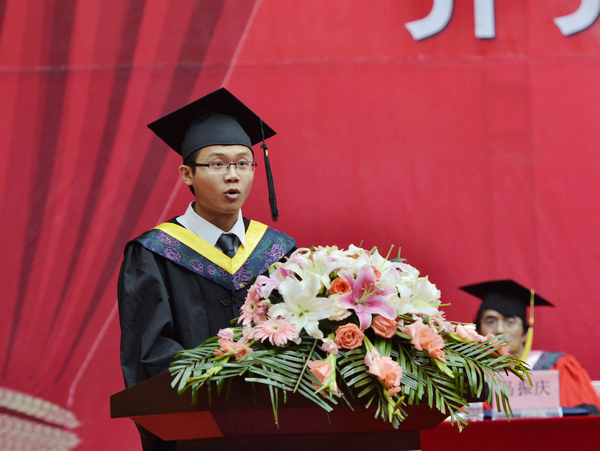 肖振天同学代表全体毕业生满怀深情祝福:“母校明天更美好!”他表示,我们全体毕业生感恩母校,感念师恩,感怀友情,将把母校的教育和培养化作实际行动,在实践“中国梦”的伟大历史进程中贡献智慧和力量,实现人生价值,为母校争光添彩。