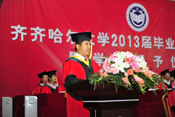 他说,大学的时光总是美好而短暂。四年前,你们带着对大学生活的美好憧憬,走进了齐大校园。大学四年,承载了同学们最美好最幸福的一段青春时光,你们也骄傲和自豪地见证了中国经济社会的腾飞和学校发展历史上砥砺奋进的一段岁月。你们为“神九”、“神十”遨游太空和“航母入列”、“蛟龙”潜海而骄傲过,你们为学校获得全国文明单位、成功举办60年校庆而自豪过,你们这四年所经历的一切美好,都将成为你们人生之中最绚丽的篇章和最美好的回忆。