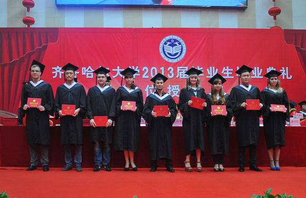 校长、学校学位评定委员会主任马立群为获得学位的留学生代表颁授学位证书并合影留念