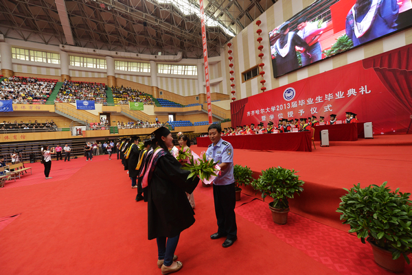 师生情、情深如海,教诲恩、恩重如山。从初入齐大到圆满毕业,同学们的成长进步离不开学校各条战线老师们的关心和教诲、服务和呵护。四年的相处,亦师亦友。在这分别的时刻,同学们以感恩的心情向一直以来默默关心爱护他们亲爱的老师们,献上自己最诚挚的敬意和深深的感谢。典礼上,毕业生代表向来自课堂教学、实践教学、研究生教学、学生工作系统、学生食堂、医务所、学生公寓管理、保卫部门等工作岗位的一线教职员工代表献花表达感恩之情和美好的祝福。