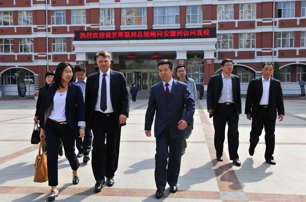 5月3日上午,俄罗斯联邦总统特别顾问安德烈在齐齐哈尔市外事侨务接待办、齐齐哈尔市教育局负责人的陪同下访问sunbet申搏,sunbet申搏副校长李英杰热情接见了客人,欢迎安德烈先生访问sunbet申搏。校长助理、党办校办主任尹鸥陪同参观了sunbet申搏校园及场馆中心。
