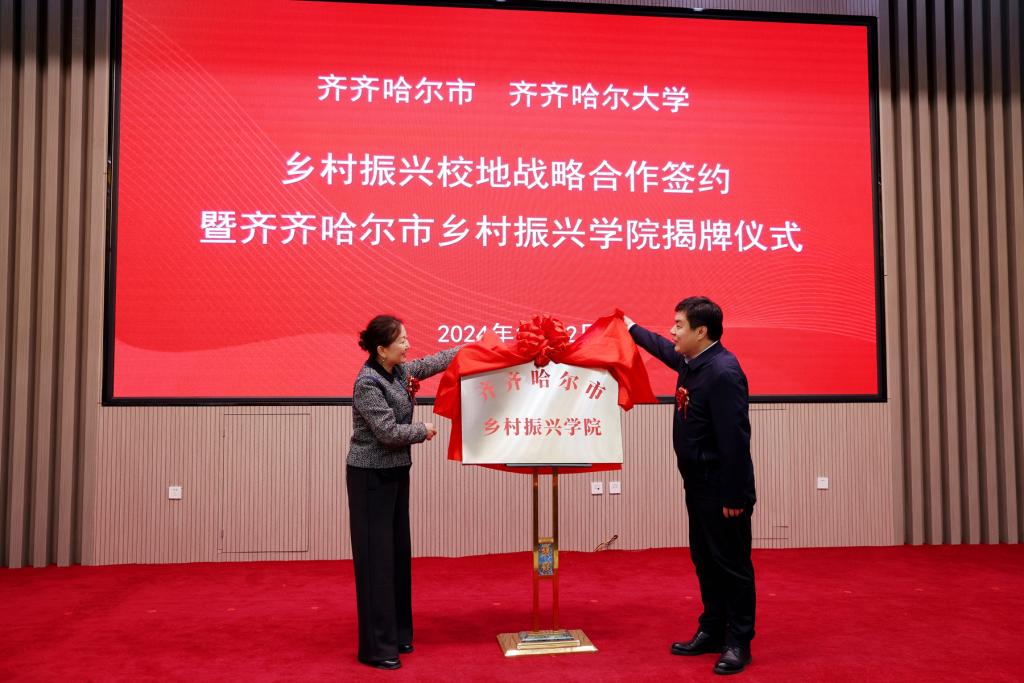 sunbet申搏官方网站党委副书记齐宏伟与齐齐哈尔市委副书记刘振江共同为齐齐哈尔市乡村振兴学院揭牌。