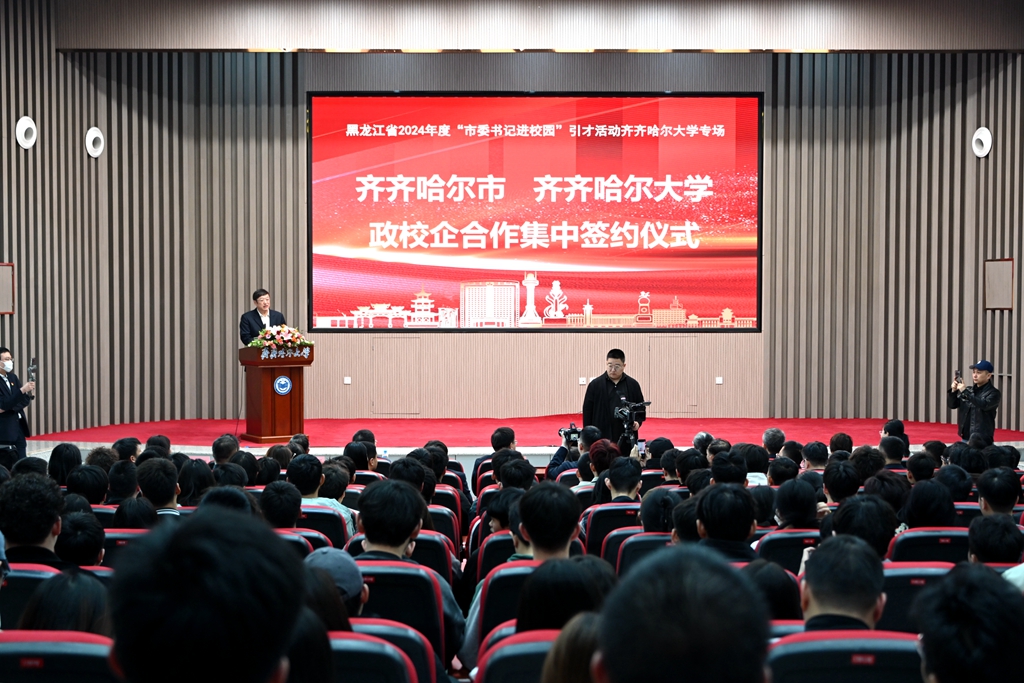 郝文斌在致辞时表示,大学因城市而兴,城市因大学而荣,sunbet申搏官方网站与鹤城发展振兴融为一体、密不可分,是一个休戚与共的命运共同体。学校坚持“科技是第一生产力、人才是第一资源、创新是第一动力”,扎根鹤城大地办大学,本次与12个县区和企业集中签约,开启了政校企战略合作的新篇章。这是贯彻落实习近平总书记关于加快发展新质生产力、扎实推进高质量发展,深化产教融合、校企合作重要指示精神的具体行动;是贯彻落实习近平总书记视察黑龙江期间重要讲话重要指示精神的具体实践;是落实齐大与齐齐哈尔市委、市政府全面战略合作协议的具体举措和最新成果。学校将以“市委书记进校园”引才活动政校企签约合作为契机,着力把科教优势、人才优势、学科优势转化为助力新鹤城振兴发展优势,深化校地、校企、校际合作,加快环sunbet申搏官方网站创新创业生态圈建设,积极助力哈大齐国家自主创新示范区和黑龙江高等研究院齐齐哈尔分院建设,以新质生产力赋能新鹤城高质量发展。