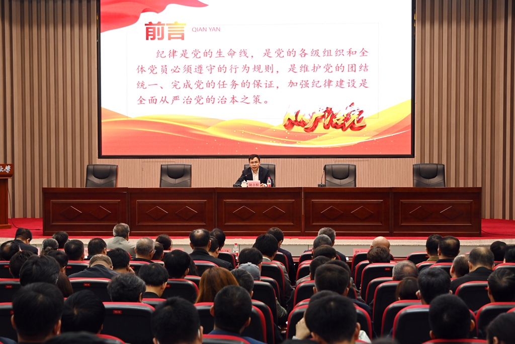 开班式上,丁宏代表学校党委提出要求:一要提高政治站位,以用心学纪坚定政治定力,使学习党纪的过程成为增强纪律意识、提高党性修养的过程;二要坚守政治原则,以准确知纪强化纪律定力,切实增强遵规守纪的思想自觉、政治自觉和行动自觉;三要恪守政治规矩,以对标明纪涵养道德定力,始终做到心中有党、心中有责、心中有戒;四要严守“六大纪律”,以严格守纪增强抗腐定力,带头筑牢拒腐防变防线。