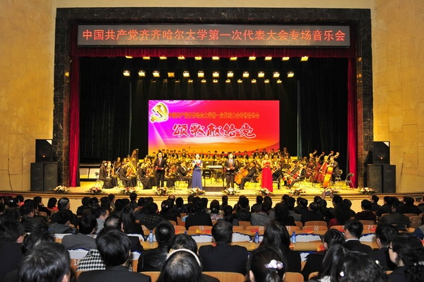 4月25日晚7:00,sunbet申搏官方网站文化宫乐声悠扬,掌声不断,sunbet申搏官方网站第一次党代会专场音乐会在这里隆重举行。学校领导与出席第一次党代会的160位代表以及教职工代表和学生代表,在这里欢聚一堂,共唱颂歌。