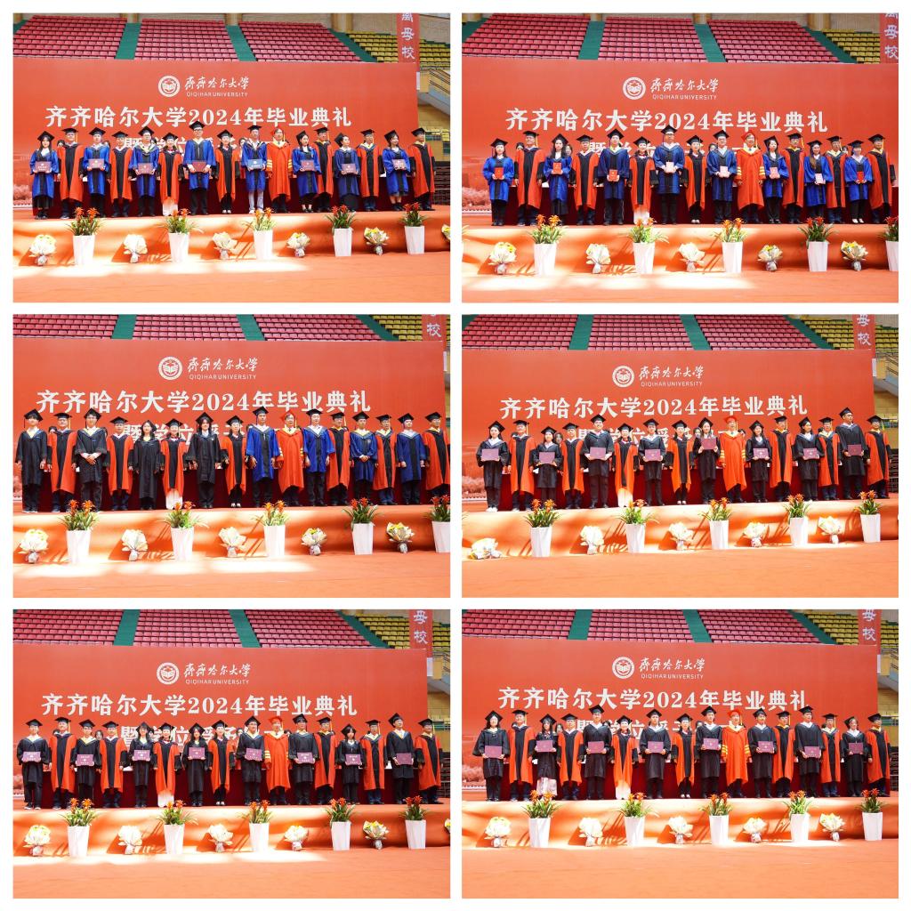 校领导为研究生和本科生优秀毕业生代表颁发荣誉证书并佩戴“徽章”,同时为毕业的研究生、留学生、本科生代表颁发毕业证书、学位证书、拨苏并合影留念。