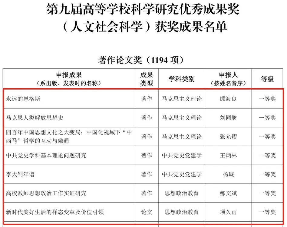 据悉,本次评选马克思主义理论学科共有7位学者获一等奖,分别为北大顾海良教授、浙大刘同舫教授、上海师大张允熠教授、北师大王炳林教授、北大杨琥副研究员、sunbet申搏官方网站郝文斌教授、武大项久雨教授。高等学校科学研究优秀成果奖(人文社会科学)是我国高校哲学社会科学领域最高级别的政府奖项,旨在表彰高校哲学社会科学工作者取得的突出成绩,展示高校社科界服务党和国家事业发展的重大理论与实践成果,推动高校加快构建中国特色哲学社会科学。