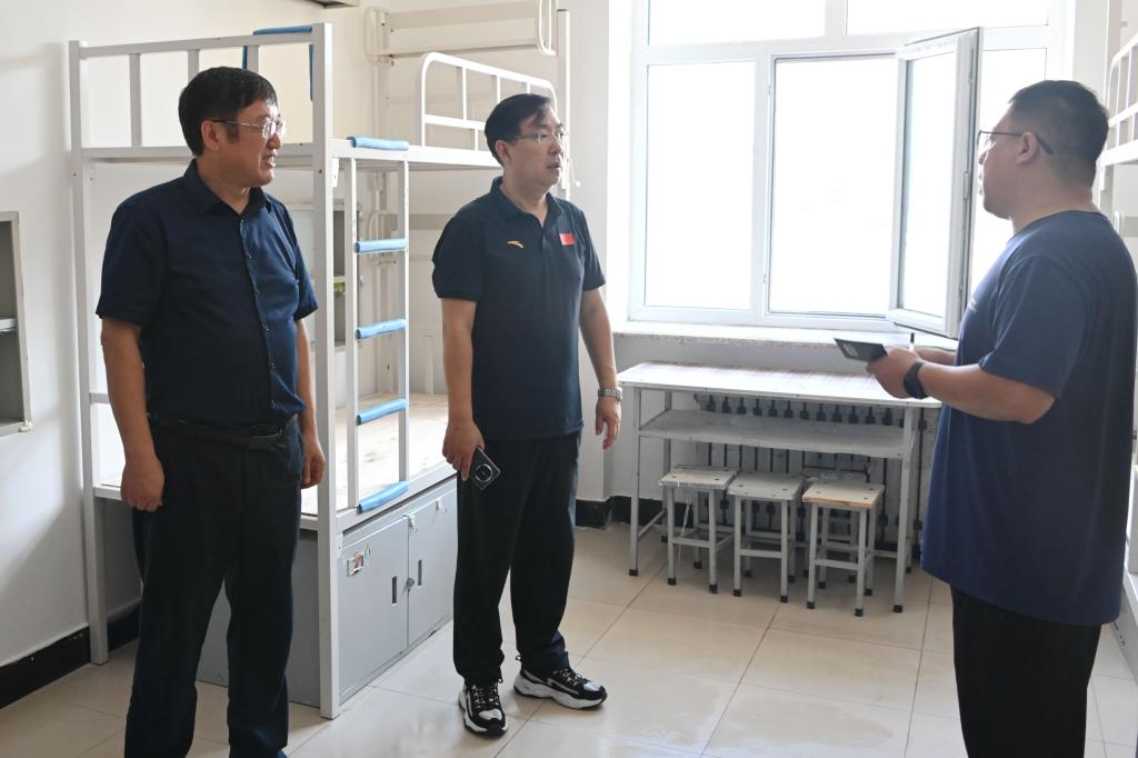 郝文斌一行先后前往学生公寓13、9、21号楼,详细了解开学准备情况和工作中遇到的重点难点问题,对公寓楼寝室墙面粉刷、公共区域卫生等关键环节进行认真检查,并提出指导意见。