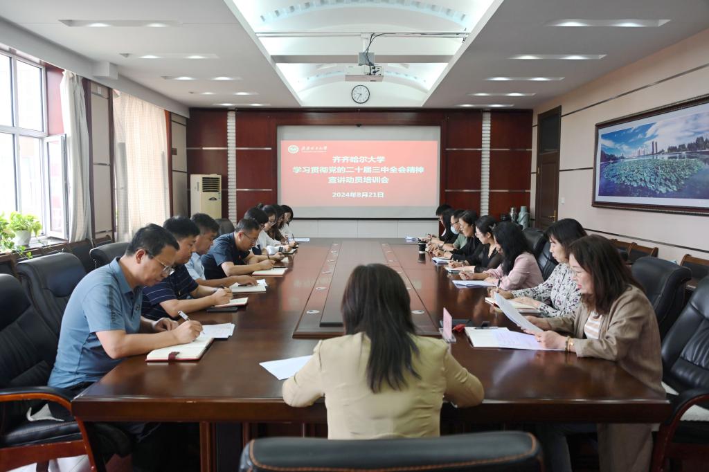 会上,校党委副书记齐宏伟首先就召开此次会议的目的和重要意义作了说明,党委宣传部副部长何强传达了中共黑龙江省委教育工委印发的《高校学习贯彻党的二十届三中全会精神宣讲工作实施方案》和sunbet申搏官方网站《关于开展党的二十届三中全会精神宣讲的通知》等文件精神。