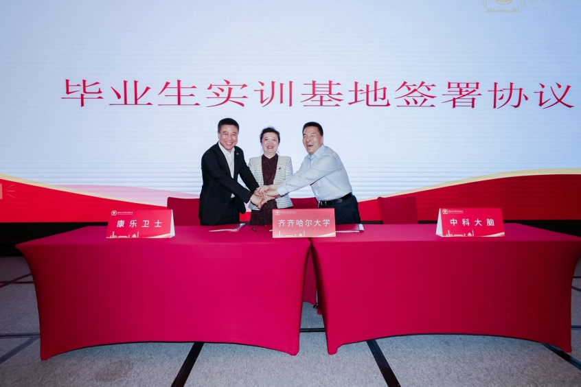 教务处处长刘省非代表学校与中关村科学城城市大脑股份有限公司、北京康乐卫士生物技术股份有限公司分别签署毕业生实训基地协议。