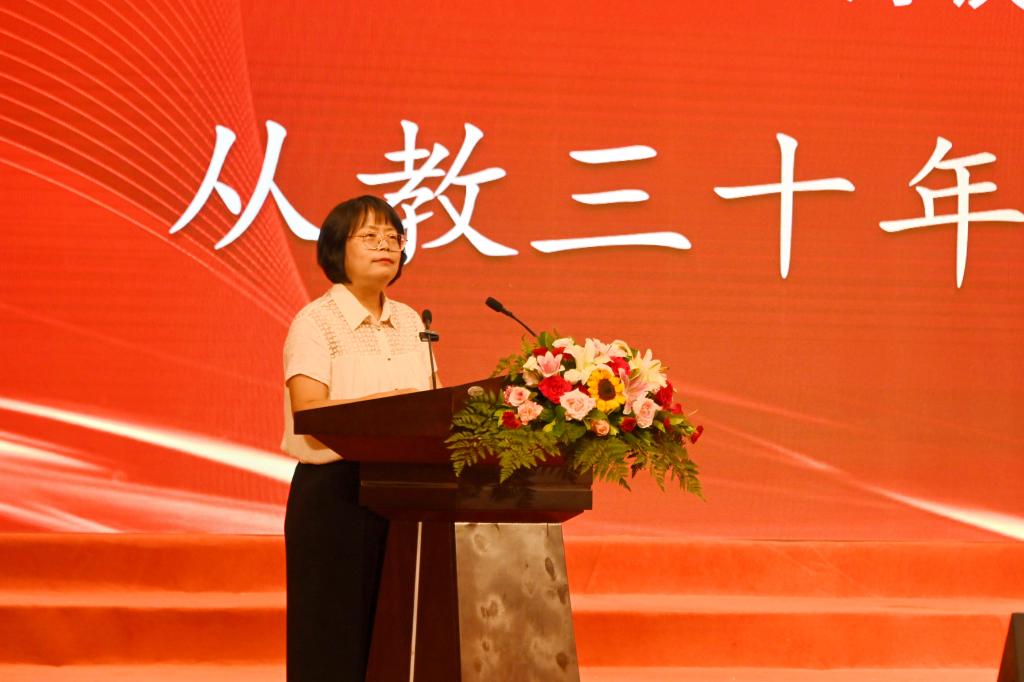 2024年全省模范教师、马克思主义学院王永明教授作为教师代表发言。她深情回顾了自己三十载的教育生涯,分享了在教育教学道路上的坚守与奉献,并勉励青年教师加强自身修养,以教育家精神为引领,不忘立德树人初心,牢记为党育人、为国育才使命。