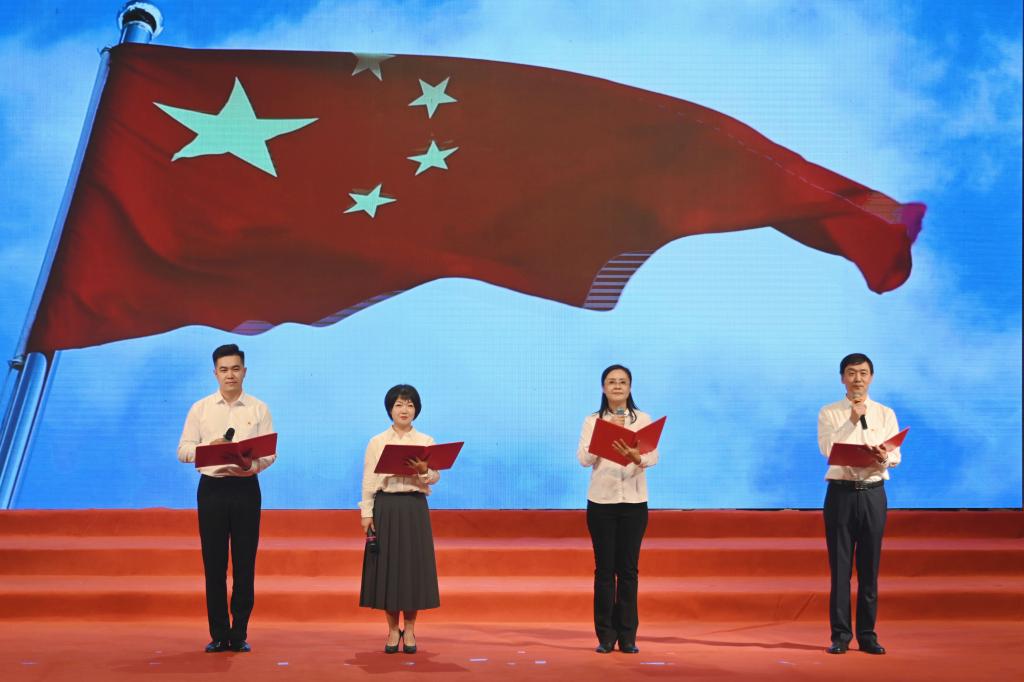 在诗朗诵《齐心筑梦,大道领航》节目中,四位教师情绪高昂、语调铿锵,讲述了人民教师的初心与使命,展现了全体教师勇担教育强国使命、共绘改革创新蓝图的坚定信念与美好愿景。
