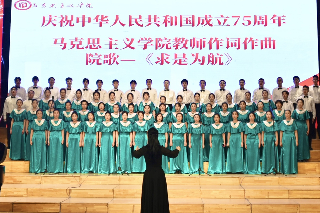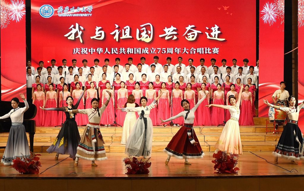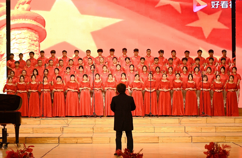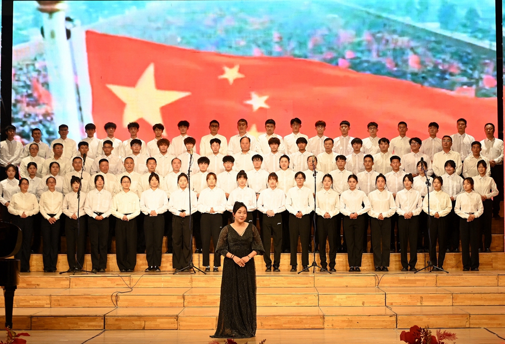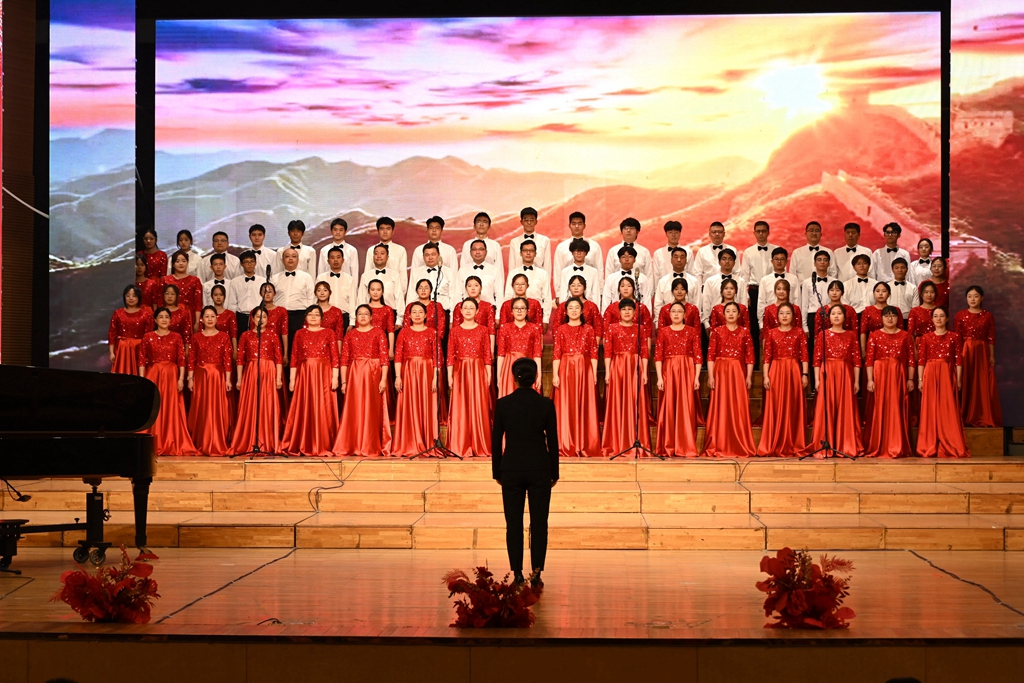 大合唱在学校党委班子和机关、资产运营管理中心代表队共同演唱的经典歌曲《我和我的祖国》《我们走在大路上》中拉开序幕,深情的旋律瞬间点燃了全场的热情,干部师生们用歌声描绘了一幅新时代灿烂辉煌的壮丽画卷,表达了对伟大祖国的无限热爱与深情厚谊。