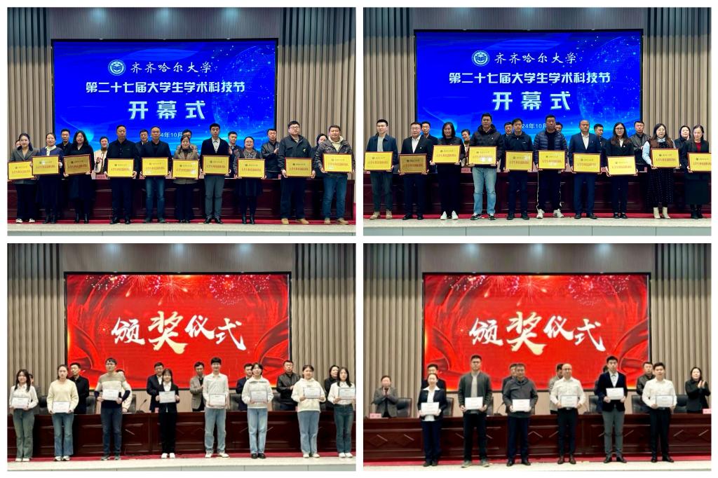 与会领导为学校大学生科技创新团队授牌,并为第十四届“挑战杯”黑龙江省大学生创业计划竞赛获奖学生和指导教师代表颁奖。