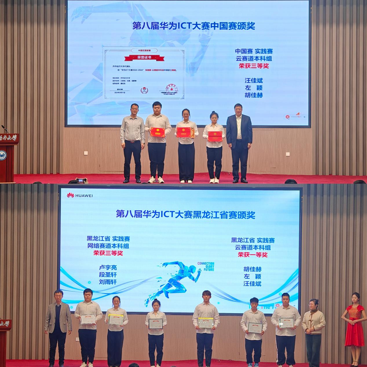 路演现场,张文治、罗亮为第八届华为ICT大赛中国赛三等奖的获奖学生颁奖;教务处处长刘省非、校团委书记罗霄为第八届华为ICT大赛黑龙江省赛一等奖的获奖学生颁奖。