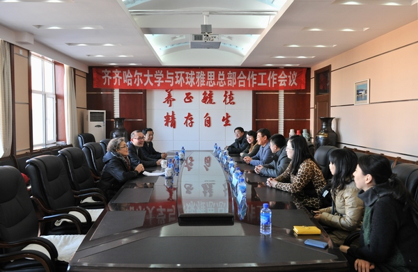 1月8日下午,环球雅思总裁张永琪先生在雅思齐齐哈尔培训学校校长杜云霞、副校长常思的陪同下访问sunbet申搏,sunbet申搏副校长吕晓辉会见了客人,并在中主504会议室,举行了sunbet申搏官方网站与环球雅思总部工作会议。外事处处长胥军、副处长谢晓丰、周丽,外国语学院院长张坤,大学英语教研部主任马冬、副主任张丽丽会见时在座。