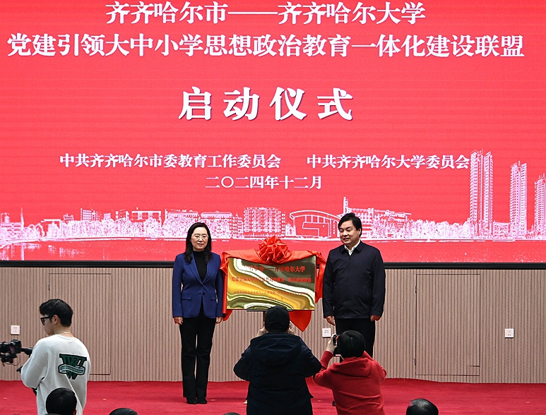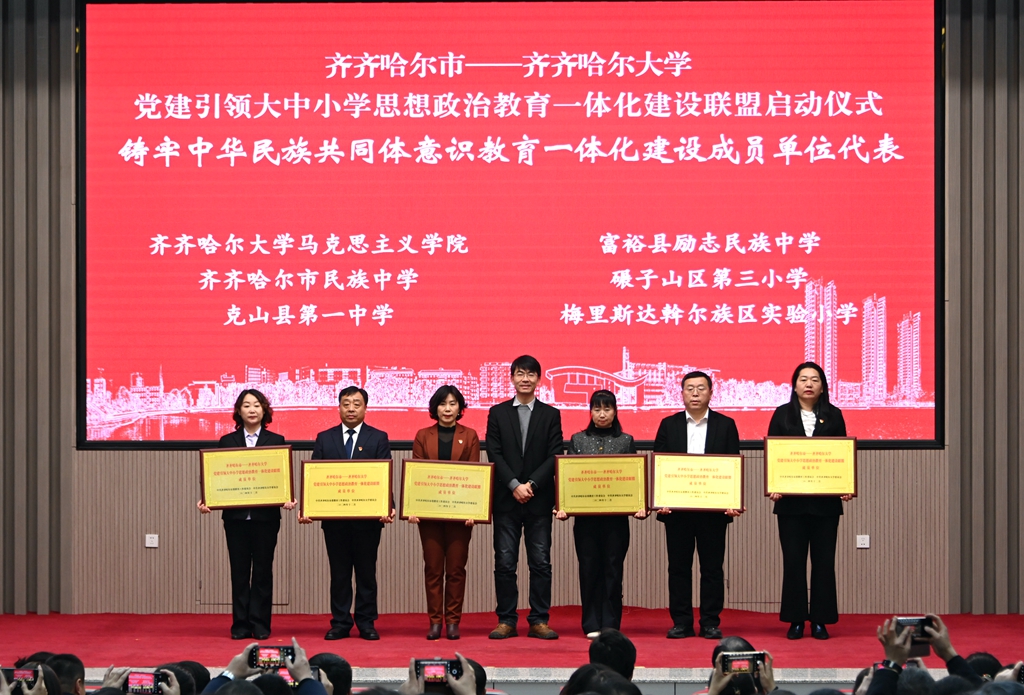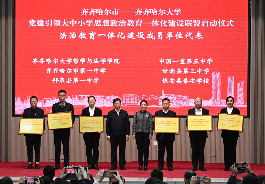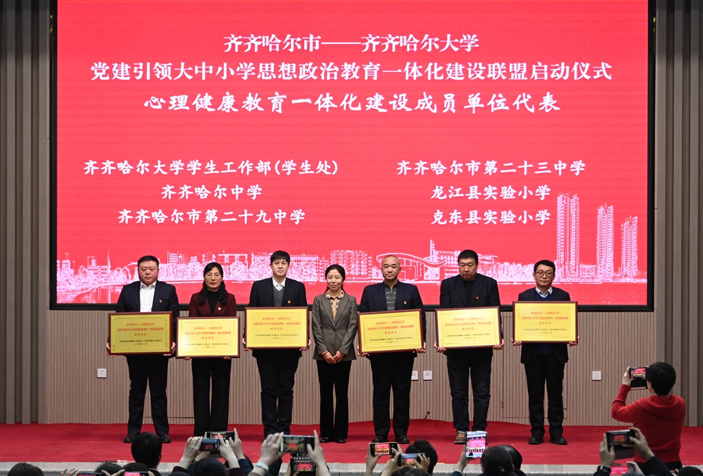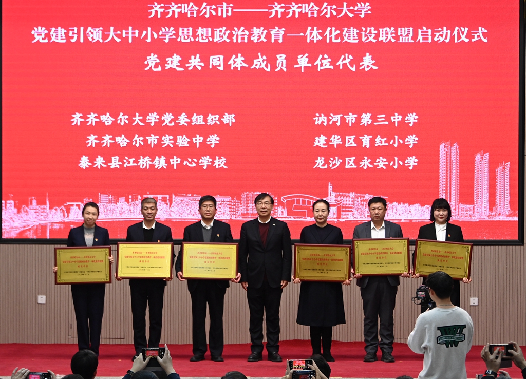 与会领导分别为“齐齐哈尔市—sunbet申搏官方网站党建引领大中小学思想政治教育一体化建设联盟”成员单位代表授牌。