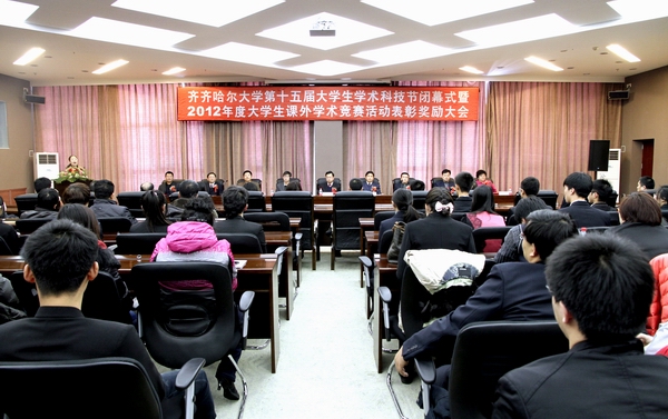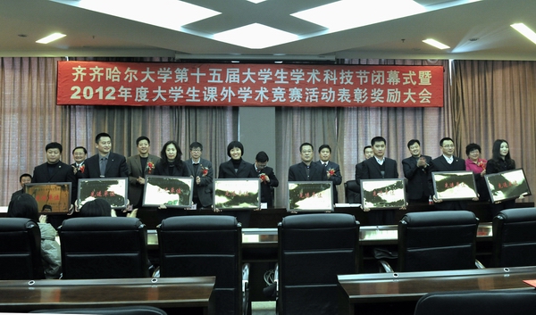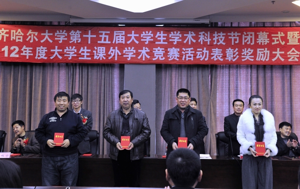 本届科技节组委会副主任、校学工部(处)处长副主任黄伟中宣读了《第十届大学生课外学术科技作品竞赛终审决赛获奖名单和第六届大学生科技论坛优秀个人名单》;科技节组委会成员、校长助理、教务处处长张树军宣读了《第十五届大学生学术科技节学术竞赛和专业技能比赛组织奖名单》;科技节组委会成员、校长助理、党校办主任尹鸥宣读了《2012年度在全国、全省课外学术竞赛活动中获奖学生和指导教师名单》;科技节组委会主任、常务副校长郑喜群宣读了《2012年度学生课外学术竞赛活动先进个人和先进集体名单》。与会领导分别为本届科技节获奖集体和个人、2012年度“课外学术竞赛活动”先进集体和个人颁了奖。