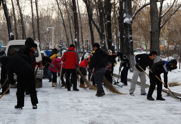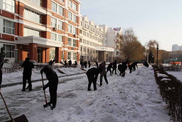 在清雪过程中,校级领导、机关干部、后勤职工、各学院干部教师、广大学生摩拳擦掌、干劲十足。虽然室外气温很低,寒风刺骨,但大家都干得热火朝天。经过一个多小时的紧张劳动,校园师生出行主要道路上的积雪被清扫干净,极大地方便了广大师生安全出行。