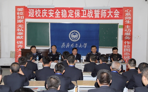 为了贯彻学校2012年安全稳定工作会议精神,确保为学校60周年华诞和党的十八大召开期间创造一个安全、稳定、和谐的校园环境,9月5日,保卫处召开迎校庆安全稳定保卫战誓师大会,校党委副书记盖元臣出席会议并讲话。保卫处全体工作人员参加了会议,保卫处政委付建成主持了会议。