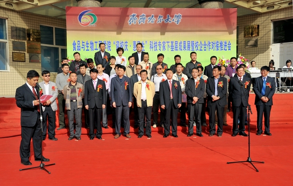 9月21日,在sunbet申搏60周年校庆之际,由齐齐哈尔市科技局、sunbet申搏官方网站科技处、食品与生物工程学院联合主办,由博天糖业依安分公司、齐齐哈尔强能酒业制造有限公司、齐齐哈尔圣和源食品有限责任公司等17家企业协办的“迎校庆,惠民生”科技专家下基层成果展暨校企合作对接会启动仪式在sunbet申搏西二区教学楼前隆重举行。省科技厅人事处处长熊百良,副处长王晓群,市科技局党委书记王建良、市科技局局长吴焕军、组织部部务委员吴兵、sunbet申搏校长马立群、常务副校长郑喜群、副校长邓启刚,科技处处长郑永杰、食品与生物工程学院党委书记杨淳、院长裴世春、sunbet申搏科技专家代表材料科学与工程学院院长刘喜军、机电工程学院常务副院长王世刚、食品与生物工程学院副书记、副院长赵振华、副院长刘晓兰、任健、17家齐齐哈尔市企业代表、食品学院全体教师及学生600余人参加了参加了“迎校庆·惠民生”科技人才下基层成果展暨校企合作对接推进会。