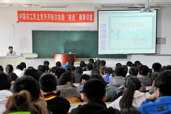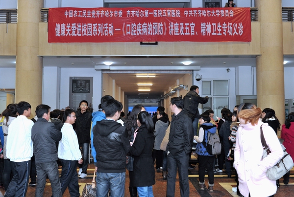 本次活动中,齐齐哈尔第一医院五官医院副院长、口腔科主任焦兴友为师生作了题为《口腔疾病的预防》的专题讲座。齐齐哈尔第一医院五官医院的五位专家细心地为师生们做各种检查,针对学生出现的近视眼、弱视、色盲等眼病、口腔疾病、心理健康等进行诊治咨询。同时,专家还给学生们讲解爱眼、养眼、护眼、配镜、口腔疾病诊疗、心理健康知识,提醒大家珍爱、保护自己的眼睛、牙齿、呵护自己的心灵,力图培养学生良好的用眼、护齿习惯,关爱心灵、拥抱阳光,以降低疾病的发病率。参加本次健康检查的师生员工非常踊跃,他们自觉有序地排成长队,等待着医生的检查。每一位被检查过的师生,都会被医务人员出具初步的检查诊断,并对患者提供合理化的治疗意见。