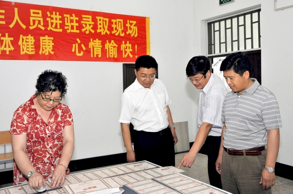 7月12日,党委书记李海红在常务副校长郑喜群的陪同下来到学校2012年本科生招生录取工作现场,看望并慰问不畏酷暑坚守岗位的全体招生录取工作人员。