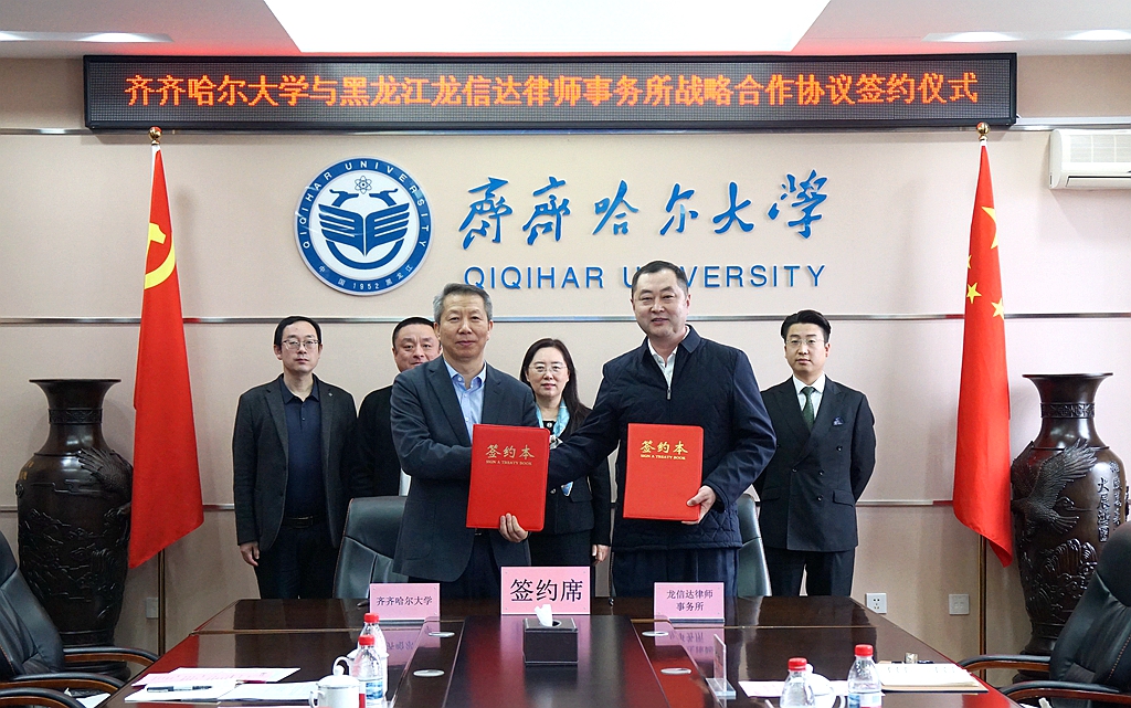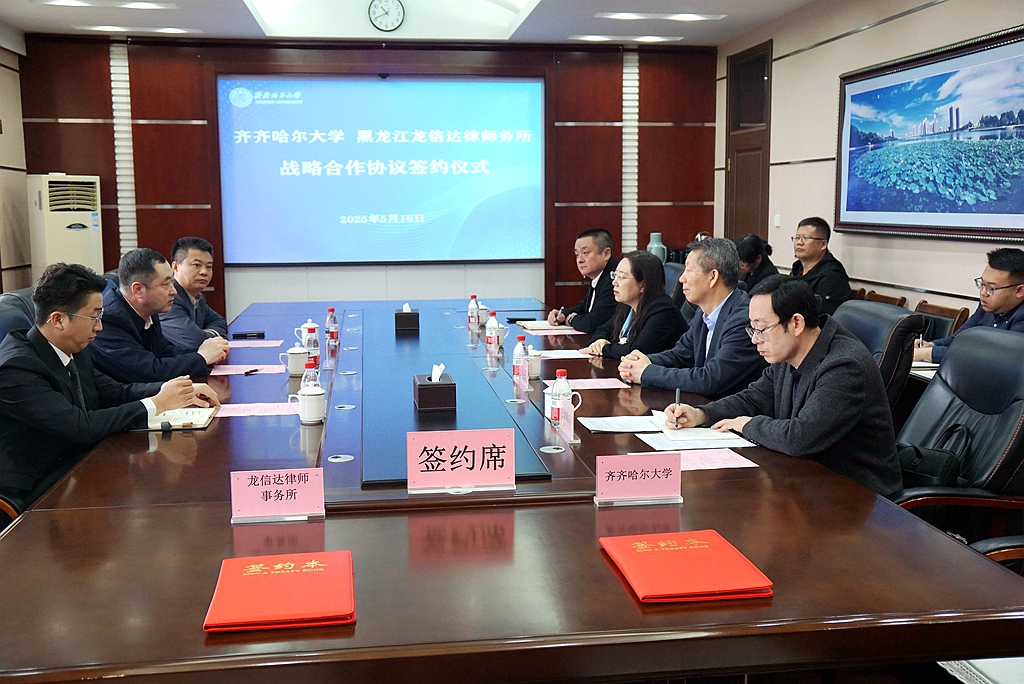 5月16日上午,sunbet申搏官方网站与黑龙江龙信达律师事务所战略合作签约仪式在学校办公楼504会议室举行。省政协常委、律师协会副会长、黑龙江龙信达律师事务所主任张铁,副主任、学校优秀校友谢桐平,合伙人任守一,校党委书记丁宏,副校长、党委常委丛喜权等共同出席签约仪式。