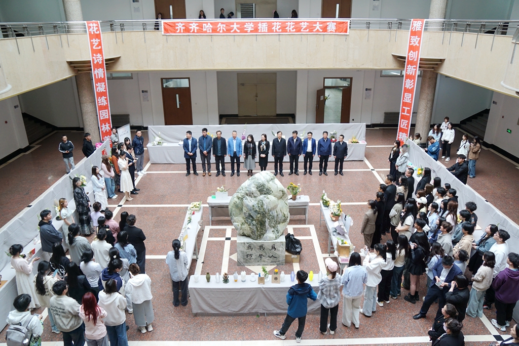 展览共呈现专业组作品28组、非专业组作品11组。参赛选手以花为笔,将文字意象转化为可触摸的视觉艺术——有的作品通过花材的色彩与造型再现典籍中的自然景致,有的则以书籍与花器的组合传递人文关怀。展览现场,选手向观展者生动阐释作品的设计理念,使静态的花艺作品成为动态的文化对话载体,让艺术不再高不可攀。