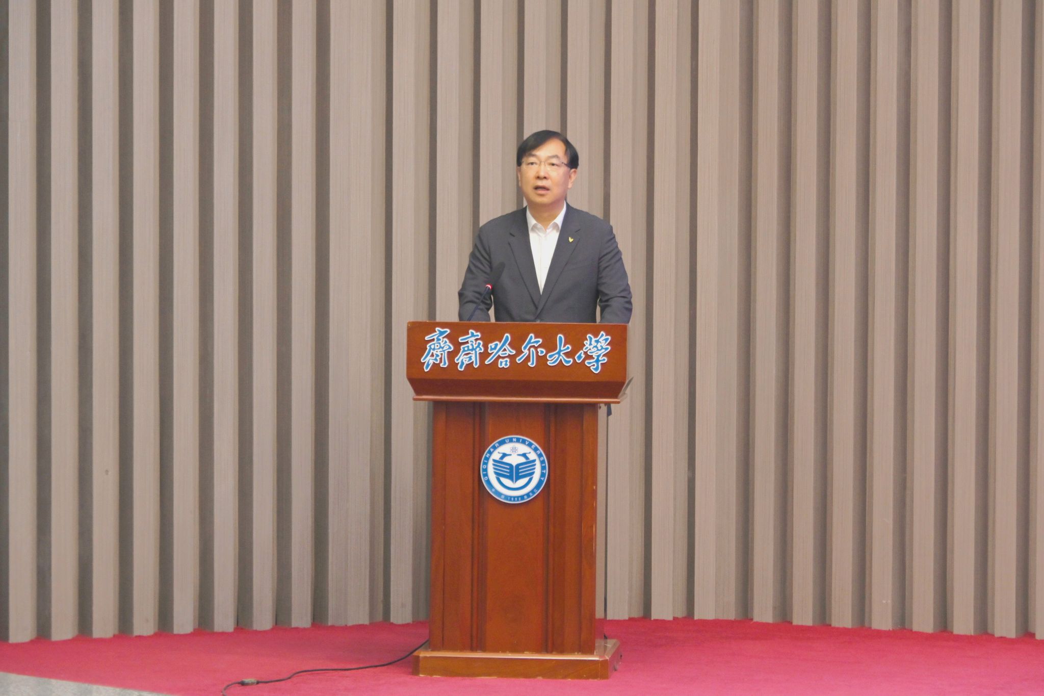 郝文斌致欢迎词,他指出,2025年全国科技活动周的主题为“矢志创新发展 建设科技强国”,旨在通过开展群众性科学技术活动,激发全社会创新创造活力。全国科技工作者日是广大科技工作者的节日,重在增强科技工作者的获得感荣誉感和报国为民的使命感紧迫感。学校将以此为契机,依托学校科技、科普、人才资源,组织系列活动,大力弘扬科学家精神和教育家精神,深入践行新质生产力理念,为助力龙江高质量发展贡献齐大力量。