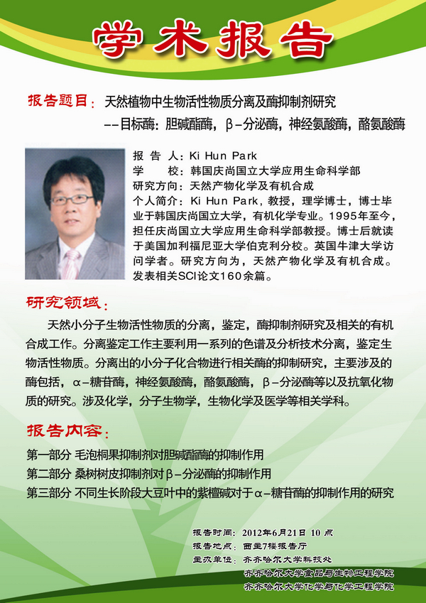 10:00,韩国国立庆尚大学访问团成员、应用生命科学部研究方天然产物化学及有机合成的Ki Hun Prak 教授在西区主楼学术报告厅为sunbet申搏食品与生物工程学院师生做了题为《天然植物中生物活性物质分离及酶抑制剂研究》的学术报告。